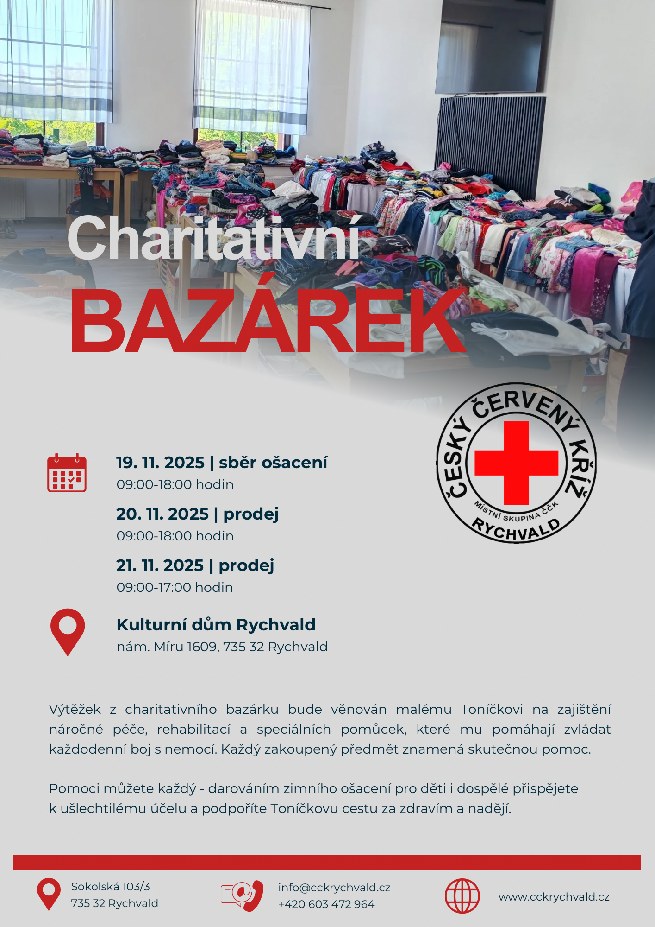 Výtěžek podzimního charitativního bazárku organizovaného Místní skupinou Českého červeného kříže Rychvald bude v plném rozsahu věnován malému Toníčkovi z Rychvald, jehož zdravotní stav vyžaduje dlouhodobou a systematickou péči, intenzivní rehabilitaci a každodenní podporu při rozvoji základních životních funkcí.