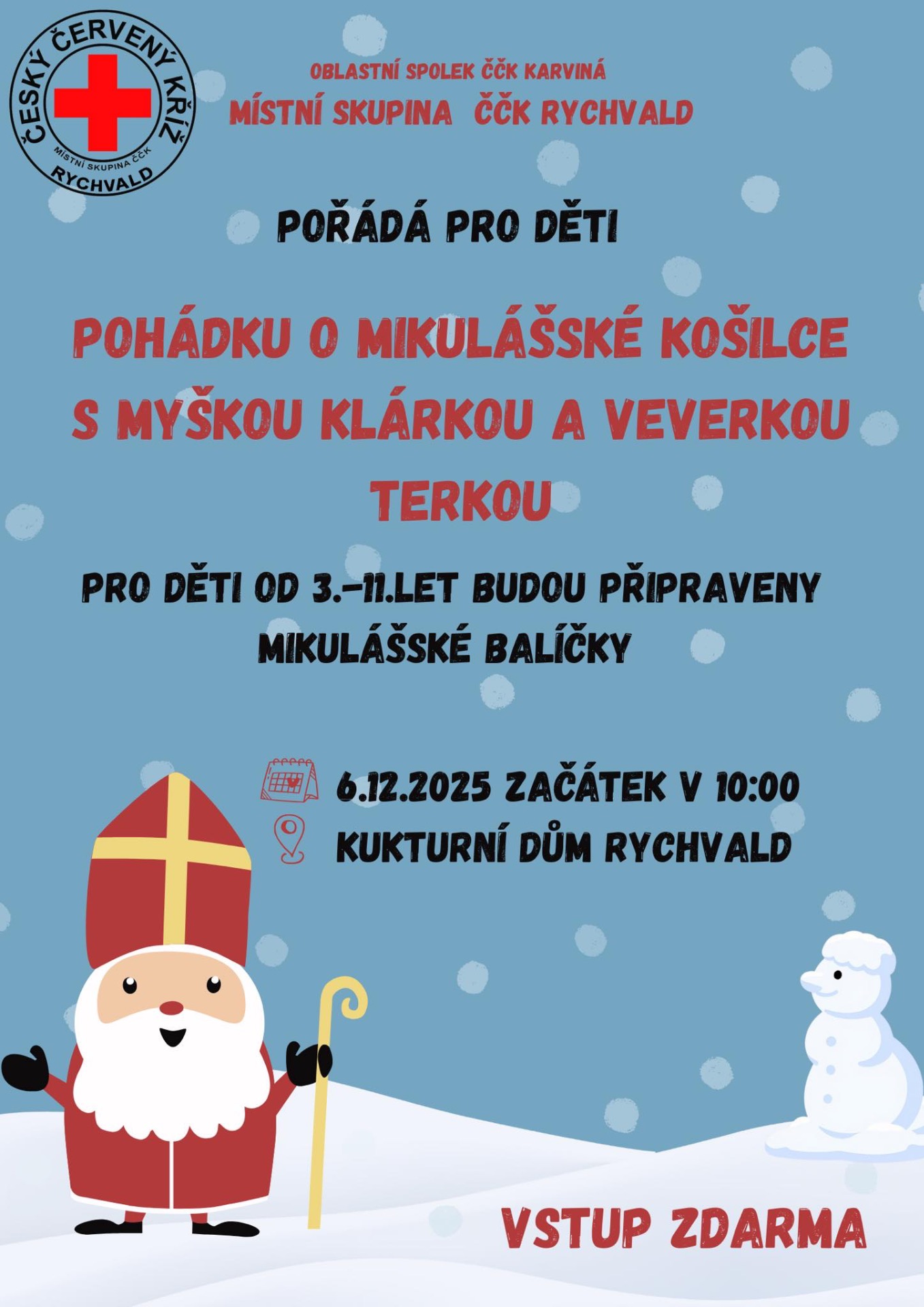 Místní skupina Českého červeného kříže Rychvald si dovoluje pozvat děti i jejich doprovod na tematické mikulášské dopoledne, jehož součástí bude pohádkové představení "O mikulášské košilce" s postavami myšky Klárky a veverky Terky.