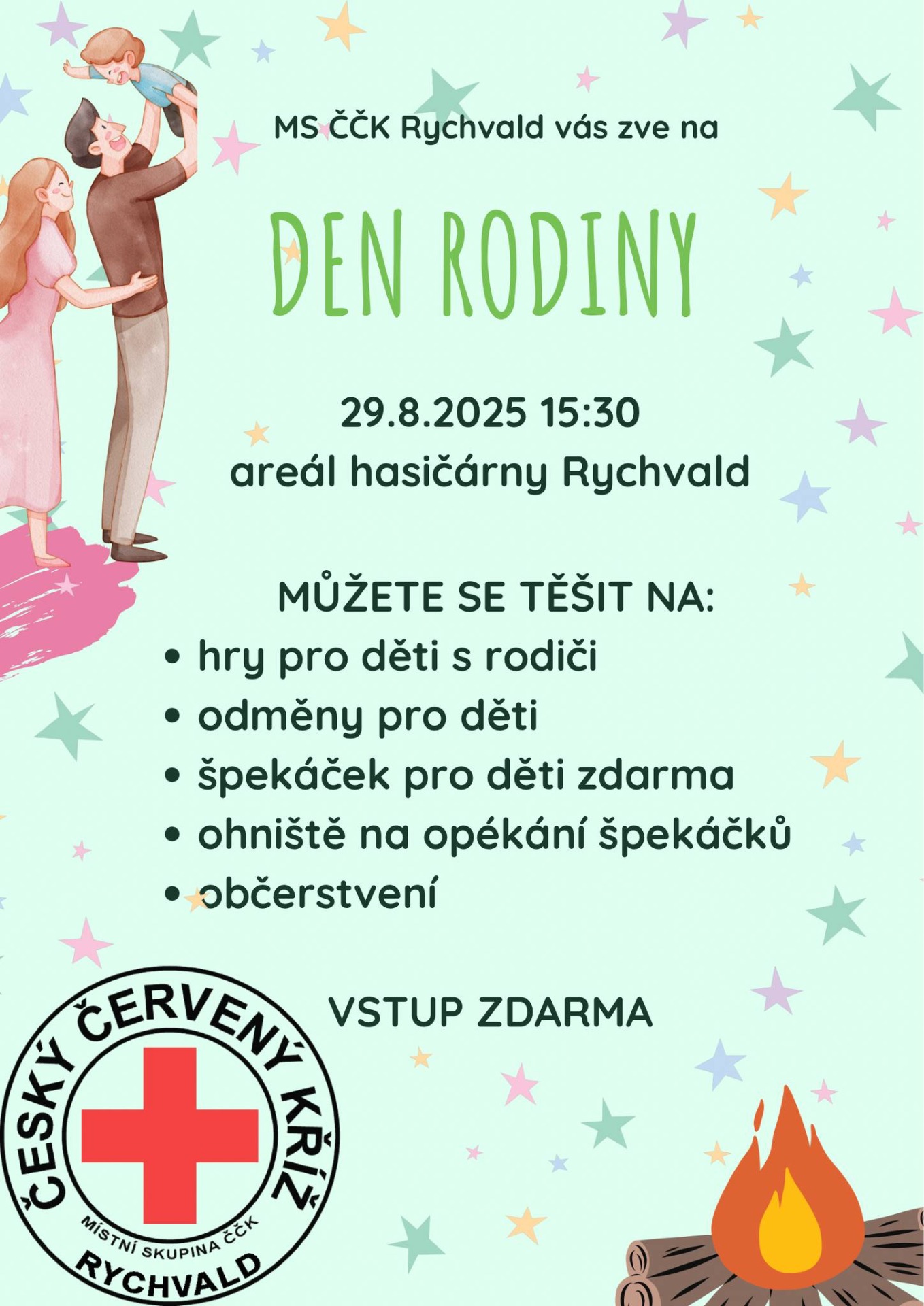 Místní skupina Českého červeného kříže Rychvald si Vás dovoluje srdečně pozvat společně s Vašimi dětmi na Den rodiny, který se uskuteční v náhradním termínu po jeho původním odložení z důvodu nepříznivých povětrnostních podmínek.