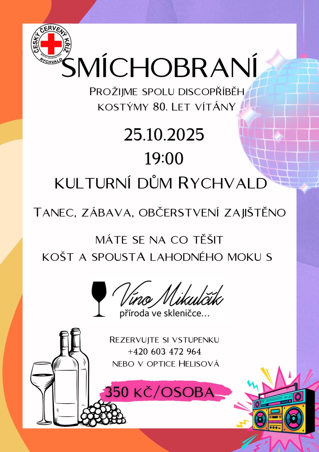 Místní skupina Českého červeného kříže Rychvald si Vás dovoluje pozvat na společenský večer "Smíchobraní" ve stylu Disco příběh, který se uskuteční již za několik dní. Akce je koncipována jako kulturně-společenské setkání s důrazem na kvalitní program, příjemnou atmosféru a aktivní zapojení návštěvníků.
